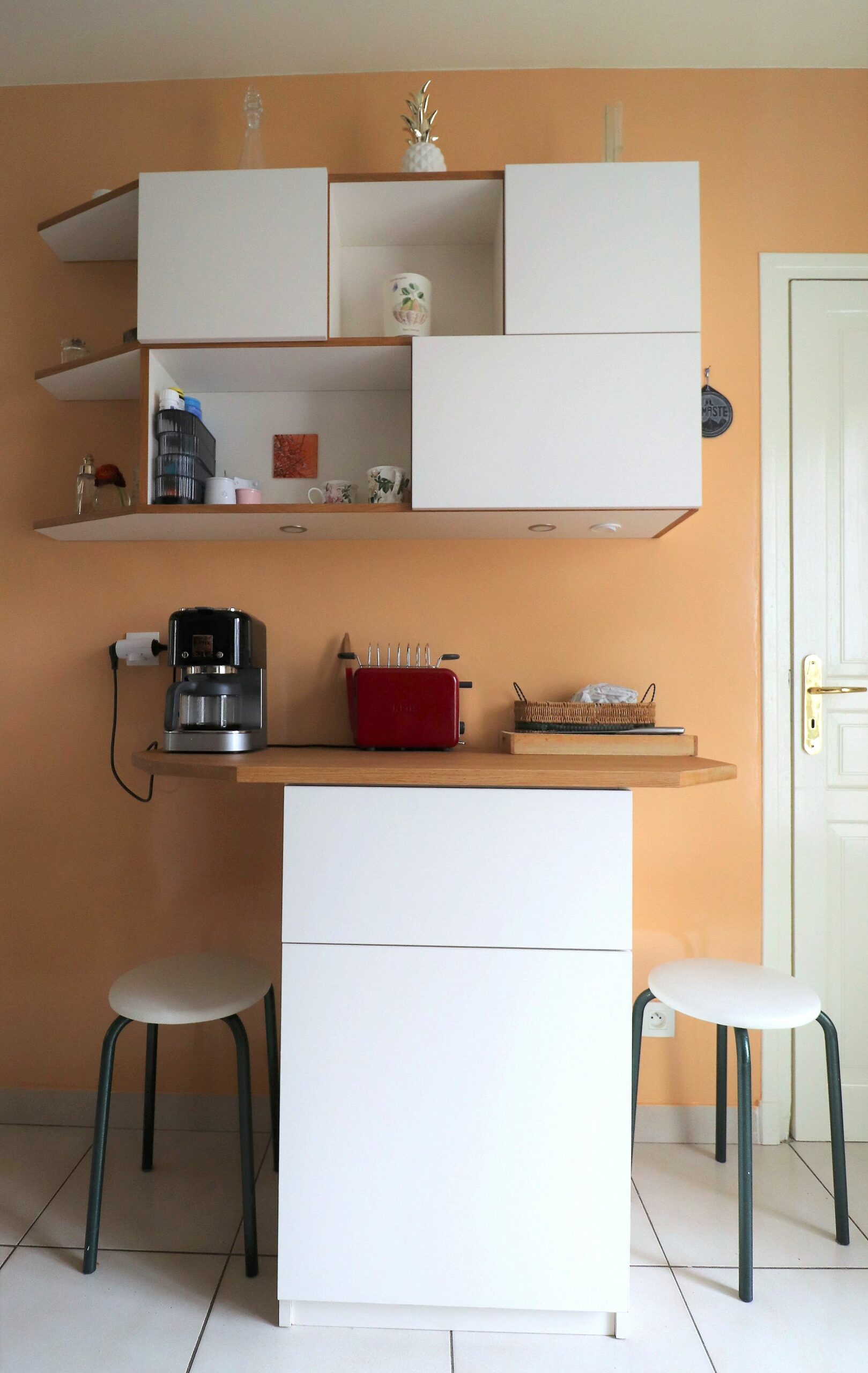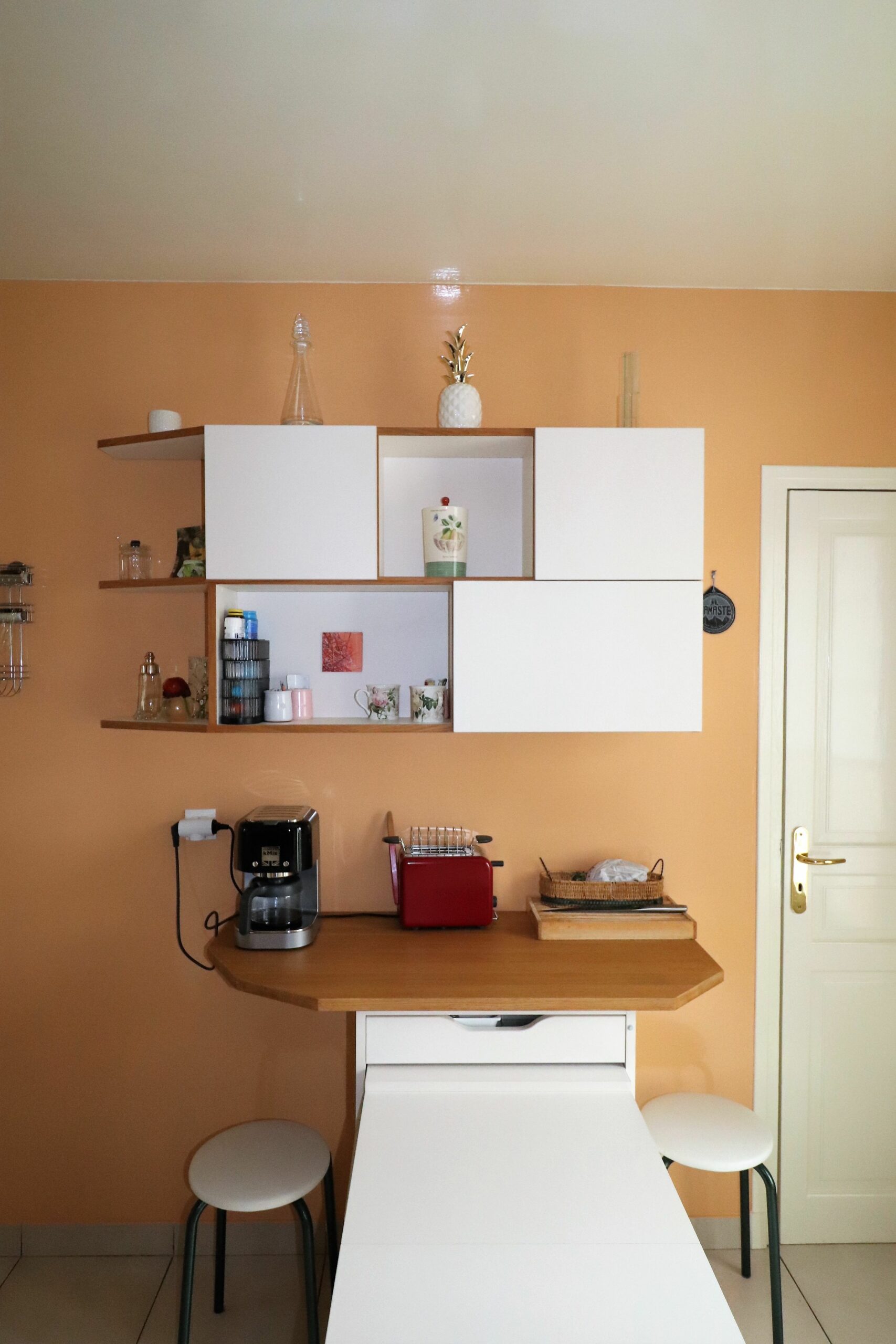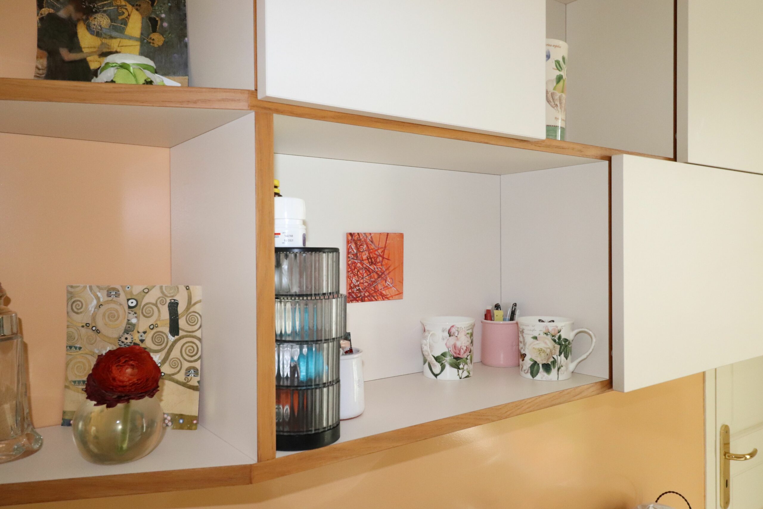 . Dans la cuisine, création d’un meuble sur mesure intégrant une tablette coulissante pour déjeuner ainsi qu’en partie haute une étagère de rangements avec niches réalisé par mon artisan menuisier