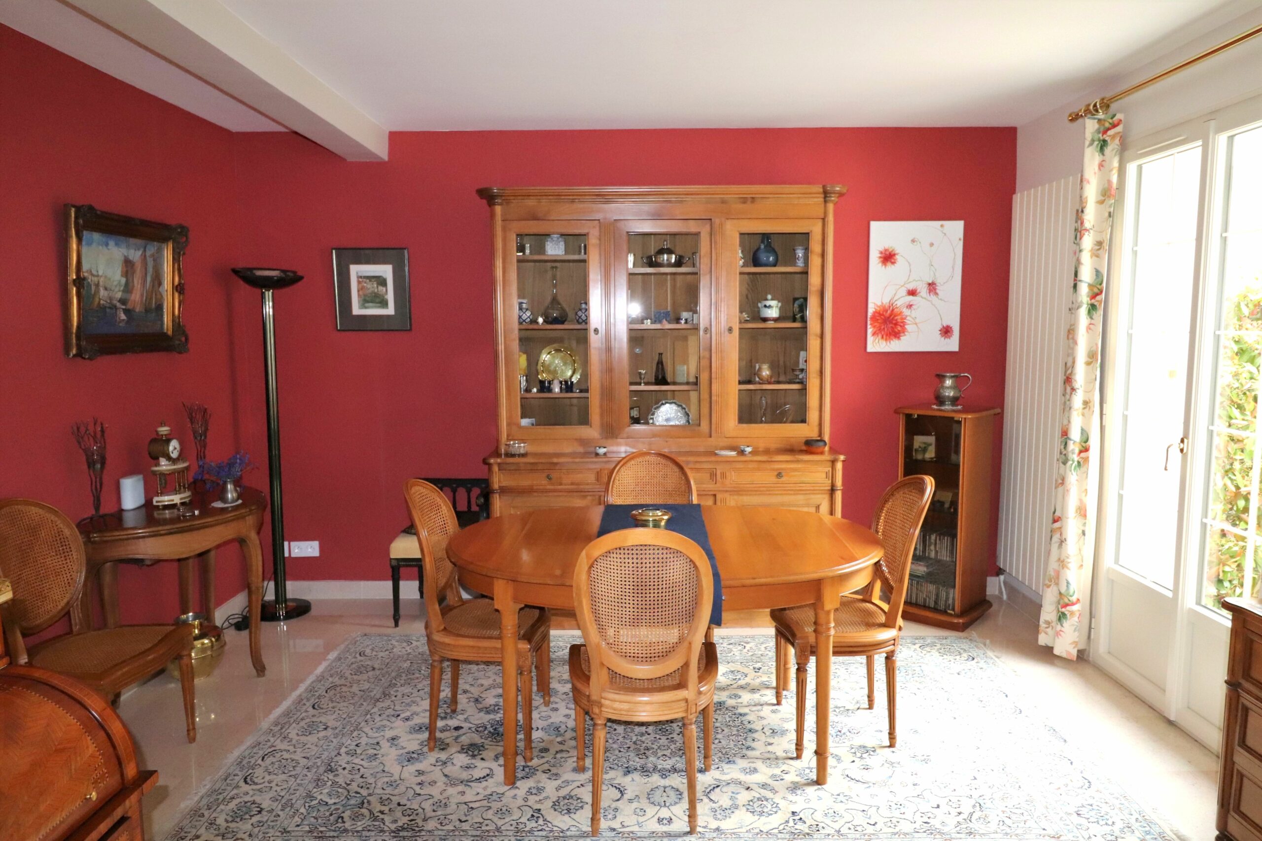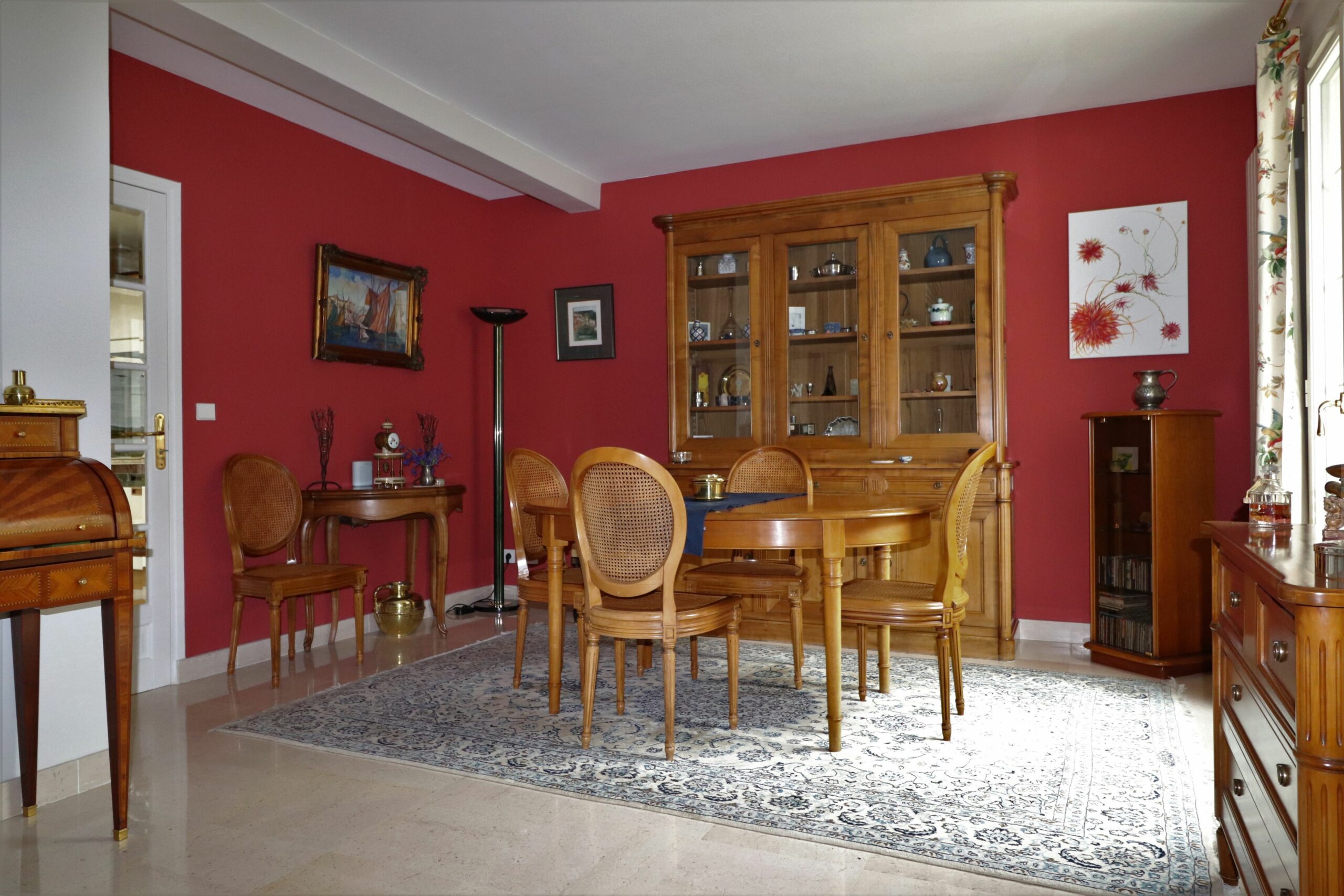 . Le vaste espace salle à manger-salon a été entièrement revu en peintures murales. Un doux beige taupe pour souligner le mur du fond et donner de la profondeur.