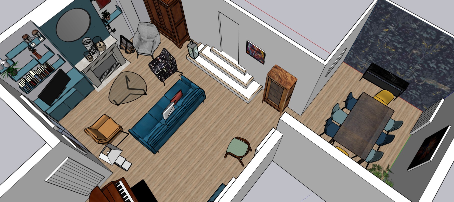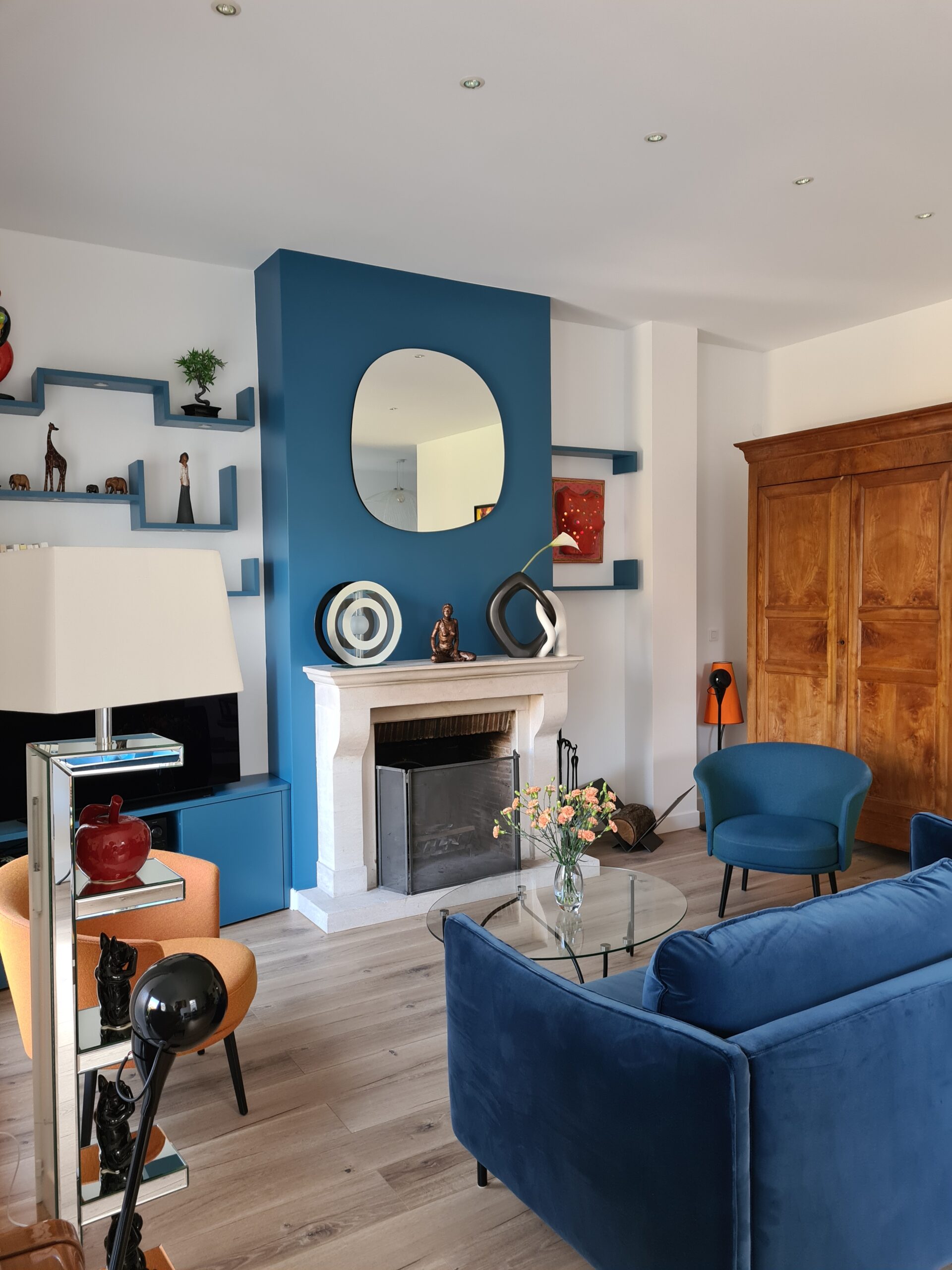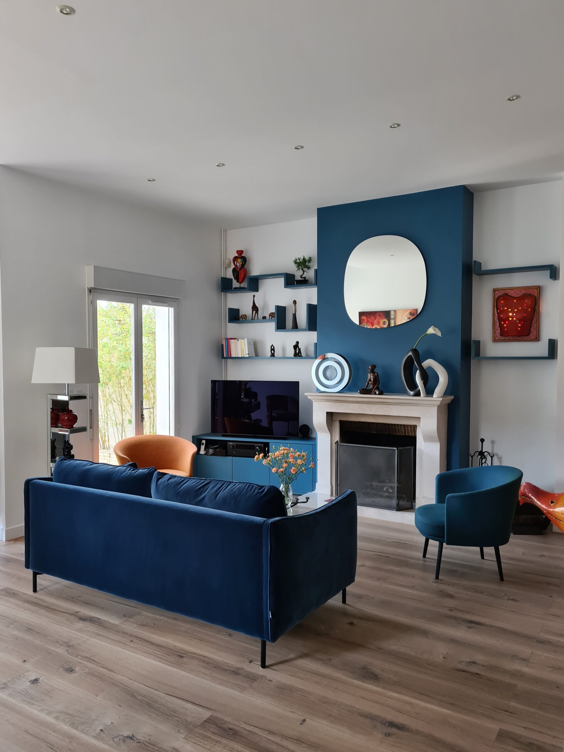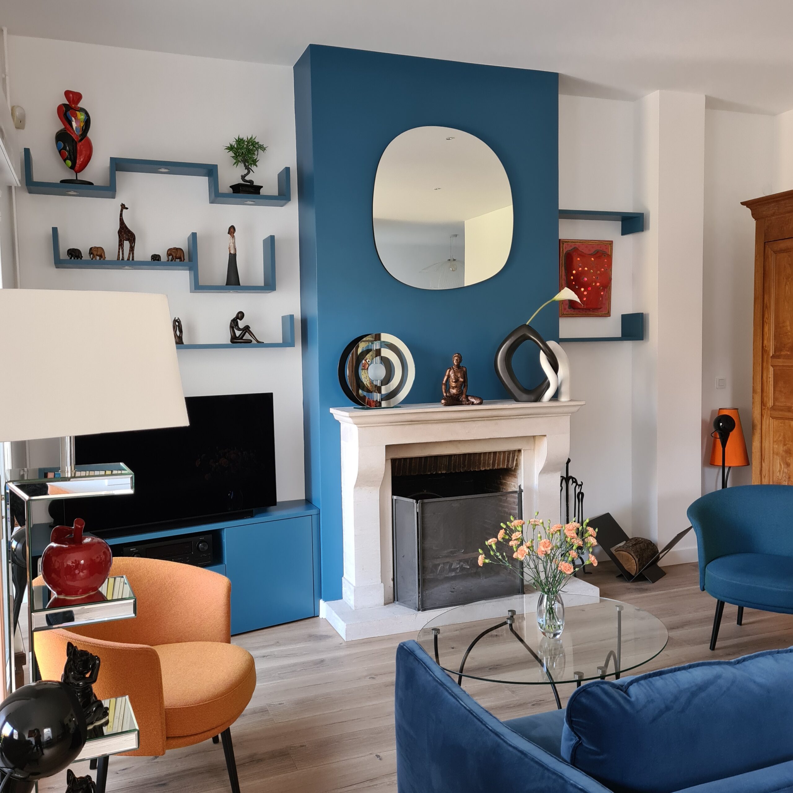 Ce même bleu profond se poursuit sur le meuble TV et les étagères asymétriques dessinés sur mesure et fabriqués par mon artisan menuisier