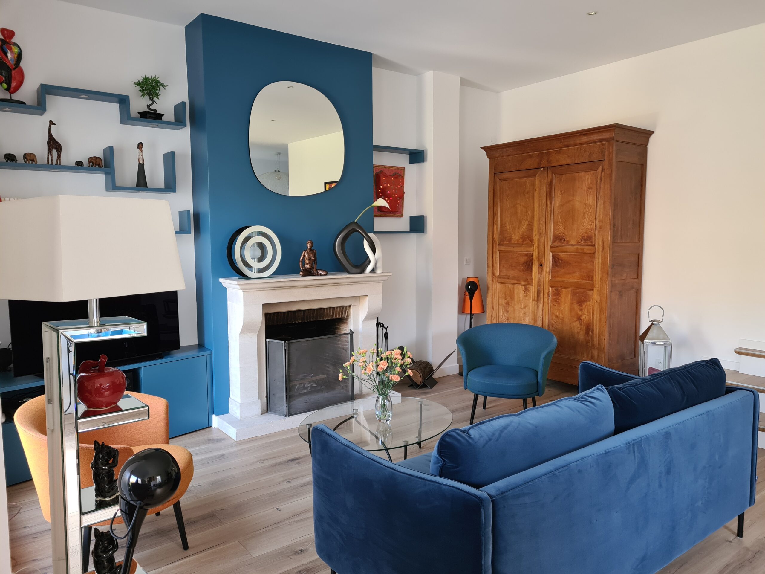Le coffrage de la cheminée prend des allures chic  et snob dans une joli teinte de bleu ; Le BLEU JAMBI (nuancier CHROMATIC)